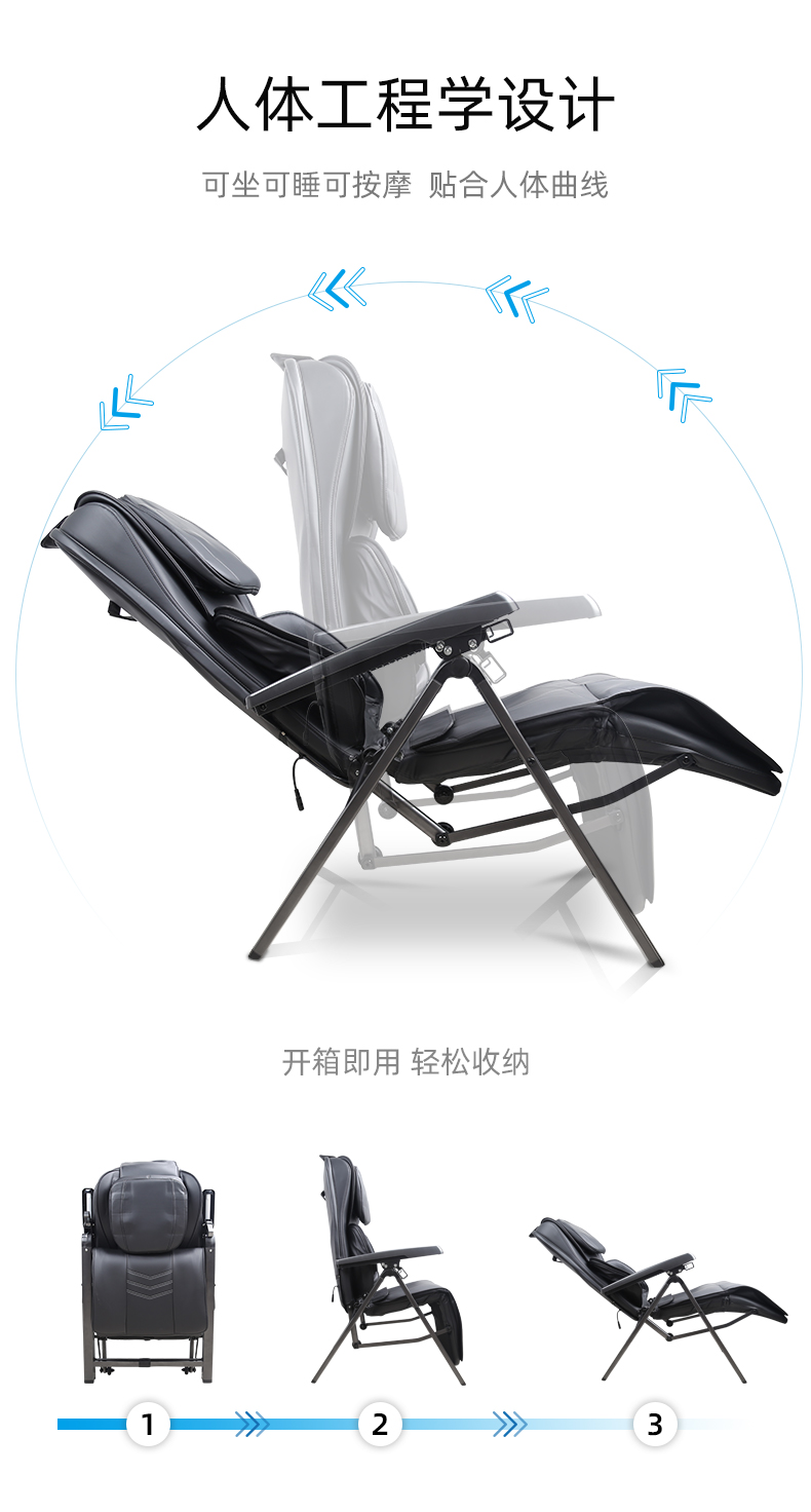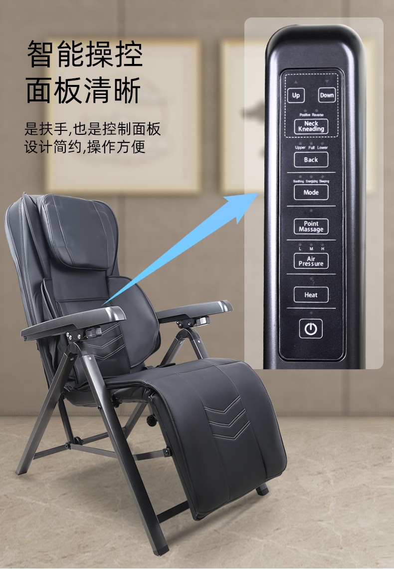 折疊式創(chuàng)意魔術(shù)拍打按摩椅1.頸部:創(chuàng)新壓肩按摩,正反轉(zhuǎn)揉捏,上下可調(diào)節(jié)高矮適應(yīng)不同人。