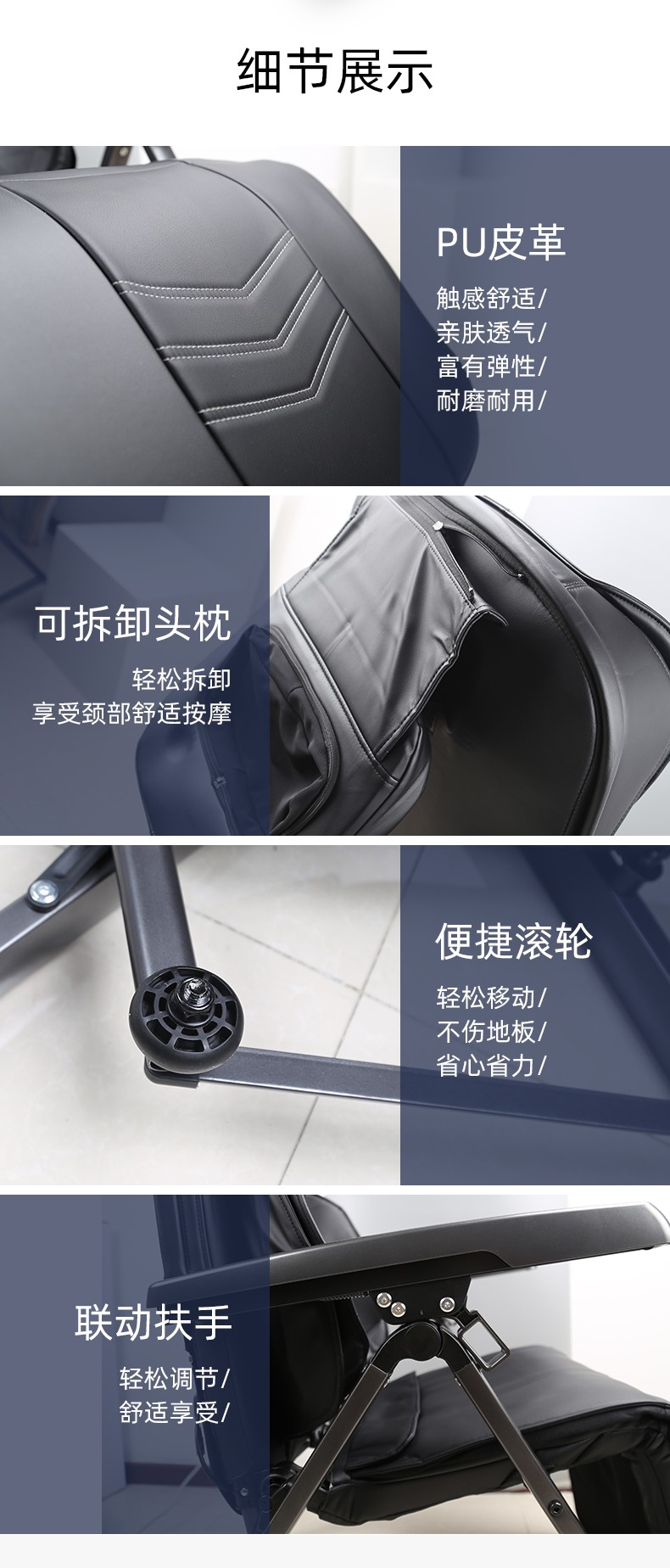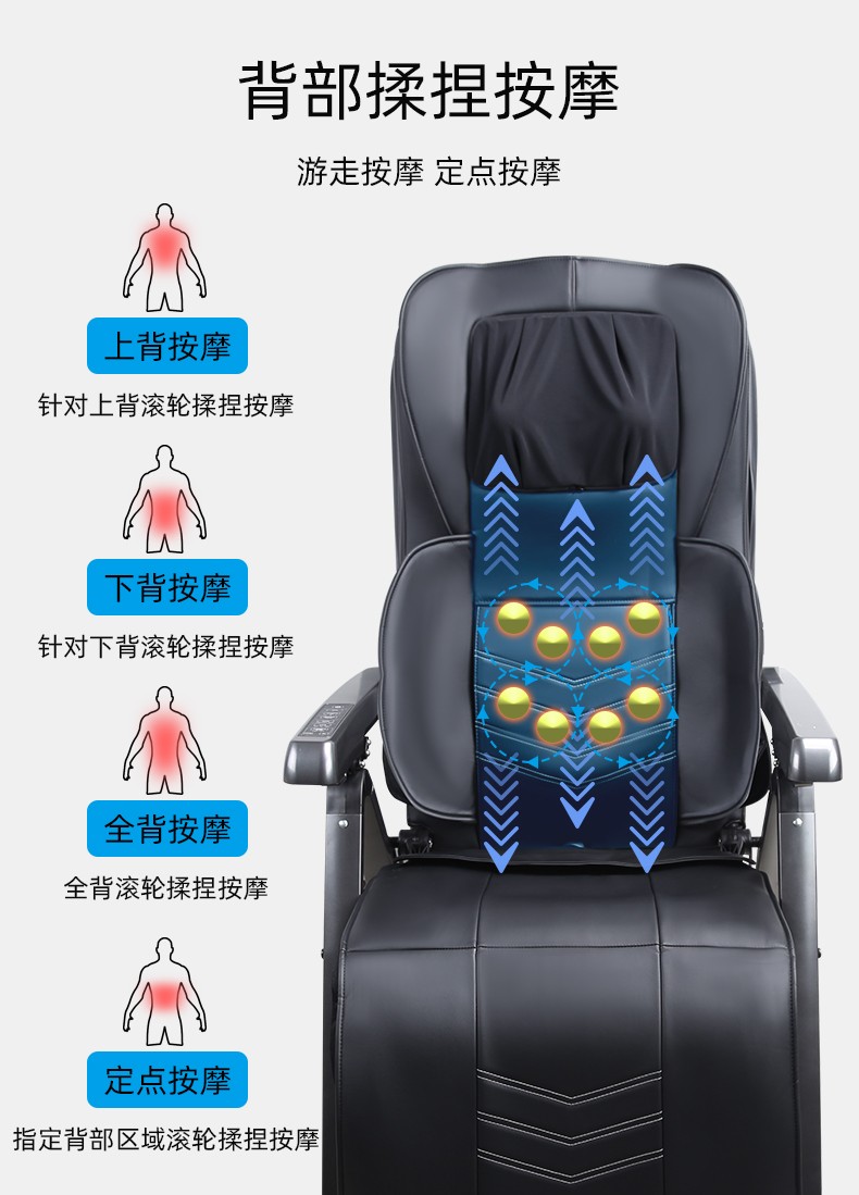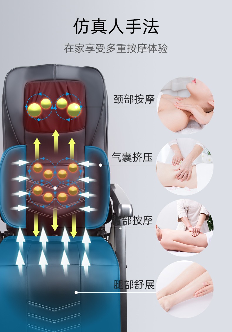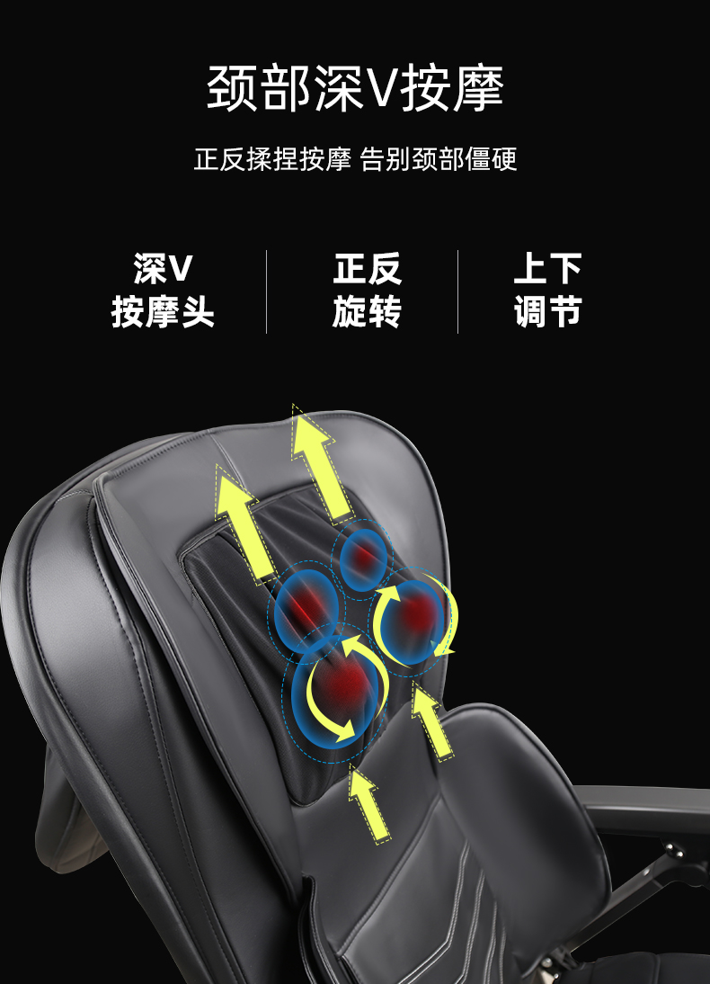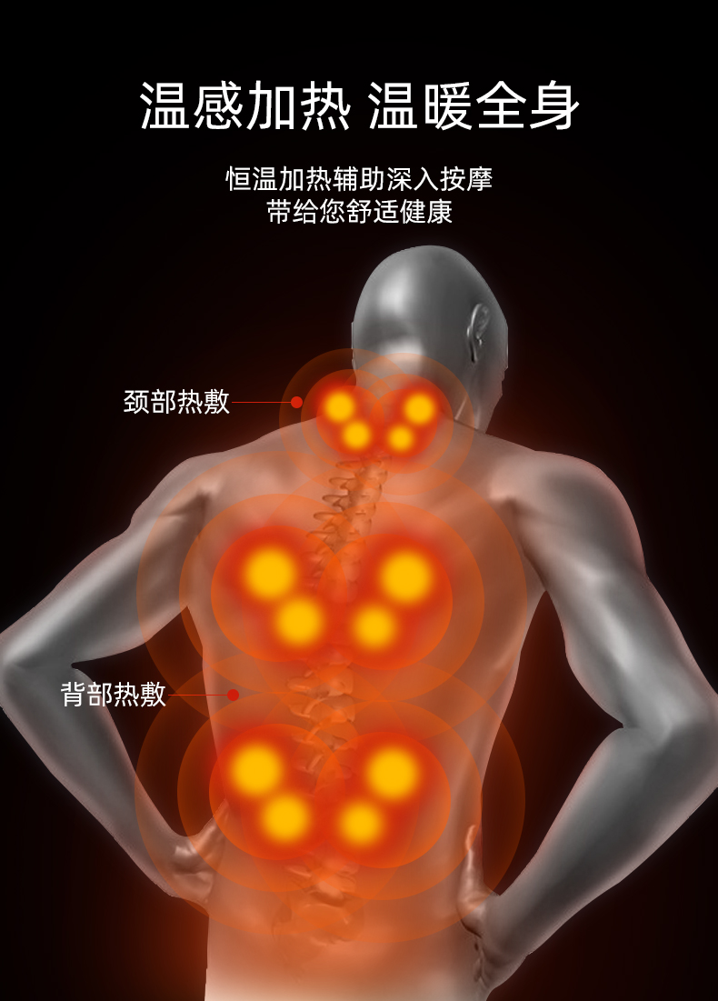 1.頸部:創(chuàng)新壓肩按摩,正反轉(zhuǎn)揉捏,上下可調(diào)節(jié)高矮適應(yīng)不同人。