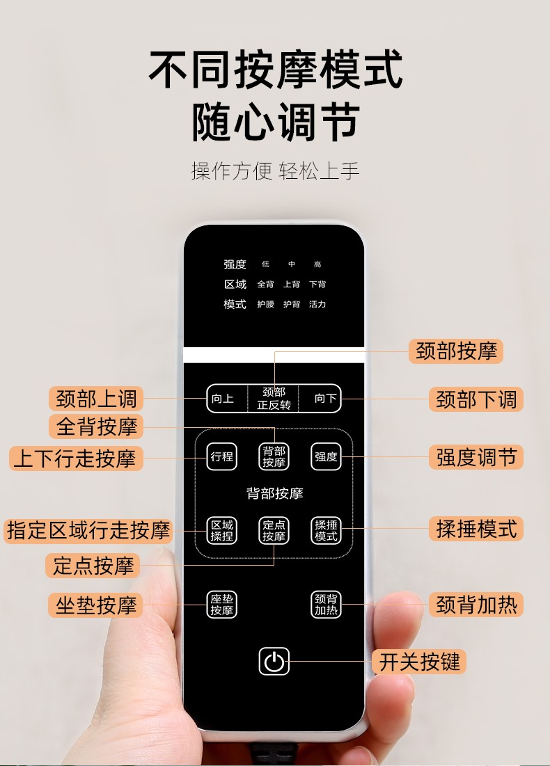2.背部:上來(lái)來(lái)回按摩,有2組共4個(gè)揉捏按摩頭,有2組2個(gè)敲擊按摩頭。